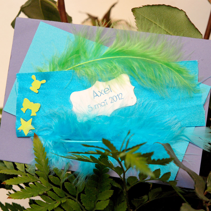 Un faire-part de naissance artisanal pour petit garçon. Anis turquoise avec plumes. Avec photo à l'intérieur.