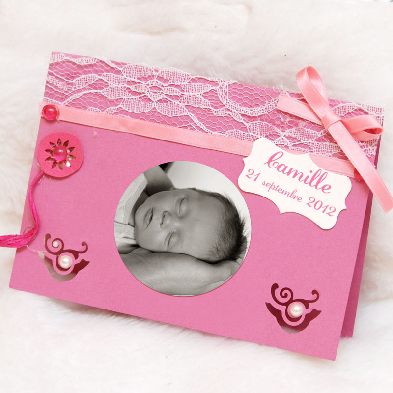 Un faire-part de naissance artisanal, rétro, rose et dentelle blanche.